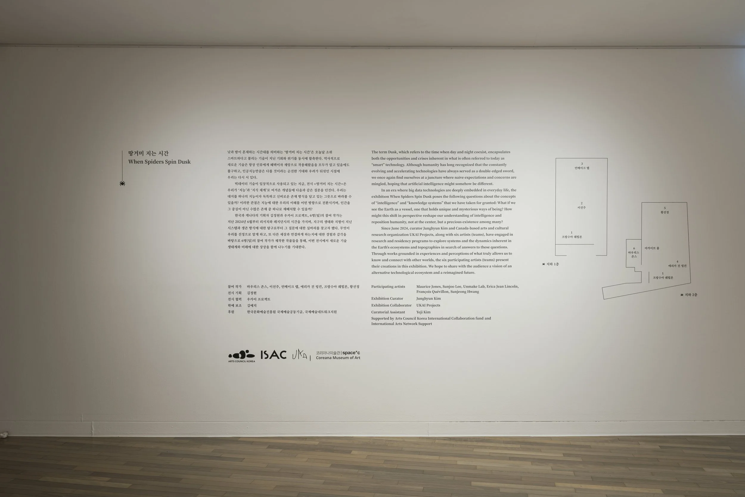 The term “Ddang-geomi(땅거미)” in the exhibition title carries dual meanings in Korean. Firstly, it refers to the dim light of “dusk”, an ambiguous moment between day and night when it is difficult to distinguish whether the silhouette over the hill is that of a dog or a wolf—a metaphor for our current uncertainty about whether today’s technologies are a blessing or a curse. Secondly, “Ddang-geomi” also refers to a spider living on the ground. In Greek mythology, the genius artist Arachne dared to challenge the goddess Athena in a weaving contest and won, only to be cursed by Athena to become a spider. The spider, symbolizing talent, has since appeared in countless fables and myths. Even without knowledge of these stories, the spider’s ability to read its environment, connect edges, and weave webs mirrors the role of the artist who observes societal phenomena, connects disparate elements, and creates something new. In this way, sunset hour becomes a project reflecting on our current circumstances, the era we inhabit, and the questions art can pose in response.